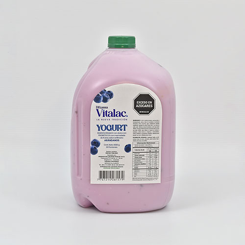 INGREDIENTES: Leche semidescremada, pasteurizada y homogenizada, azúcar, dulce de arándanos ((arándano destrozado, azúcar (sacarosa), agua, estabilizantes (almidón modificado), regulador de acidez (citrato de sodio y/o ácido cítrico), sabor idéntico al natural (arándanos), color negro index 28440)), colorante artificial rojo mora (carmoisina index 14720 y azul index 42090), sabor idéntico al natural y/o artificial a arándanos, cultivos lácticos (L. bulgaricus, S. thermophilus), cultivos probióticos (Lactobacillus acidophilus y Bifidobacterium animalis ssp. lactis y Bifidobacterium breve).