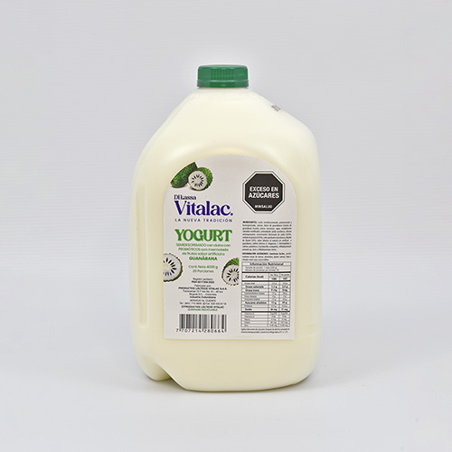INGREDIENTES: Leche semidescremada, pasteurizada y homogenizada, azúcar, dulce de guanábana ((mota de guanábana licuada, azúcar (sacarosa), agua, estabilizantes (almidón modificado), antioxidante (ácido ascórbico), silicona antiespumante, conservantes (benzoato de sodio 0,05 %, sorbato de potasio 0,05%), color aprobado (color blanco, dióxido de titanio USP)), sabor idéntico al natural y/o artificial a guanábana, cultivos lácticos (L. bulgaricus, S. thermophilus), cultivos probióticos (Lactobacillus acidophilus y Bifidobacterium animalis ssp. lactis y Bifidobacterium breve).